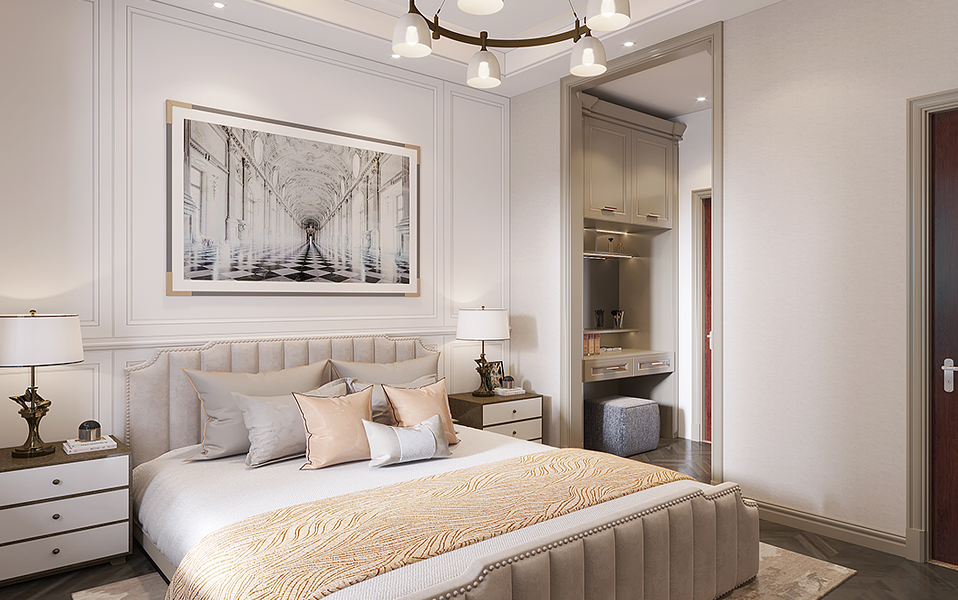 一般都會(huì)把主臥內(nèi)的收納空間發(fā)揮到極致,讓家具兼具時(shí)尚與機(jī)能的雙重功能。比如定制衣柜,男女的衣服類型不同,儲(chǔ)物的需求也不同。女主人一般需要懸掛區(qū)較多來放置裙子等長衣服,男主人需要褲架區(qū)比較多來放置褲子領(lǐng)帶等衣服。衣柜做到頂設(shè)計(jì),不積灰易清理,而且使整個(gè)房屋空間線條感十足。